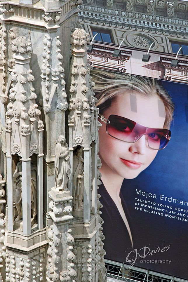 Taken from the roof of the Duomo at Milan, I was taken by the contrast of the cathedral’s stonework and the large poster behind.