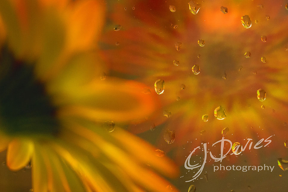 The raindrops are on the window between the reflection (at the back) of the flower at the front.
