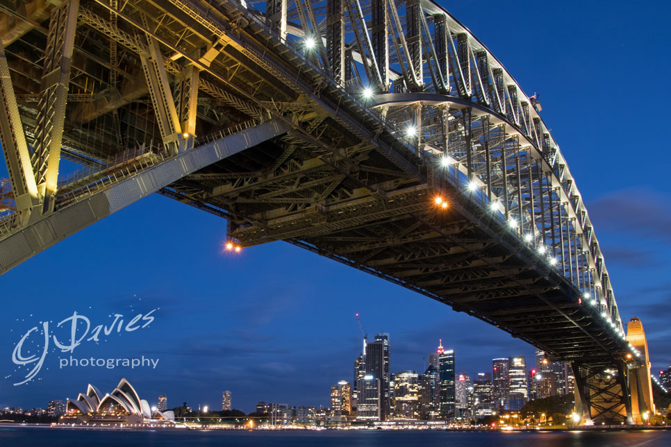 A view of the evening skyline including the Harbour bridge and the Opera House, Sydney, Australia.