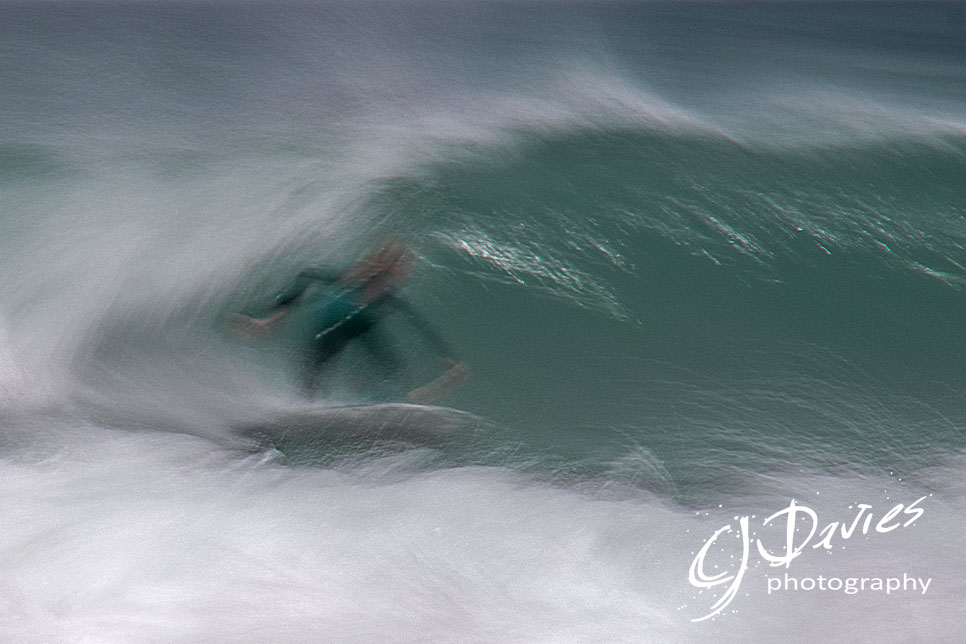 A long exposure with panning of a surfer tackling the waves at Trevaunance Cove, St Agnes, Cornwall.