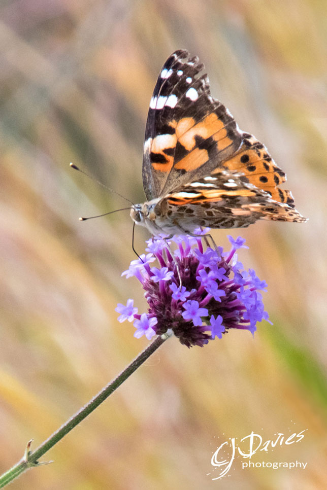 Painted Lady butterfly on verbena, against a blurred background.